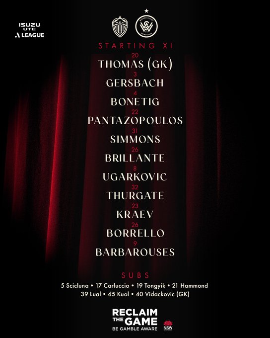 รายชื่อตัวจริงของ Western Sydney Wanderers: 20-โธมัส, 3-เกอร์สบาค, 4-โบเน็ตติเกอ, 31-ซิมมอนส์, 22-ปันตาโซโปลอส, 25-บริลแลนท์, 8-อูการ์โควิช, 23-เคลย์ ฮัสแบนด์, 32-เซอร์เก็ต, 9-บาร์บาโรสเซส, 26-โบเรลโล