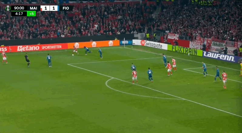 23' พิคโคลีมีโอกาสที่ดีเยี่ยมในโซน 3 วินาที แต่ผู้รักษาประตูไมนซ์เซฟไว้ได้