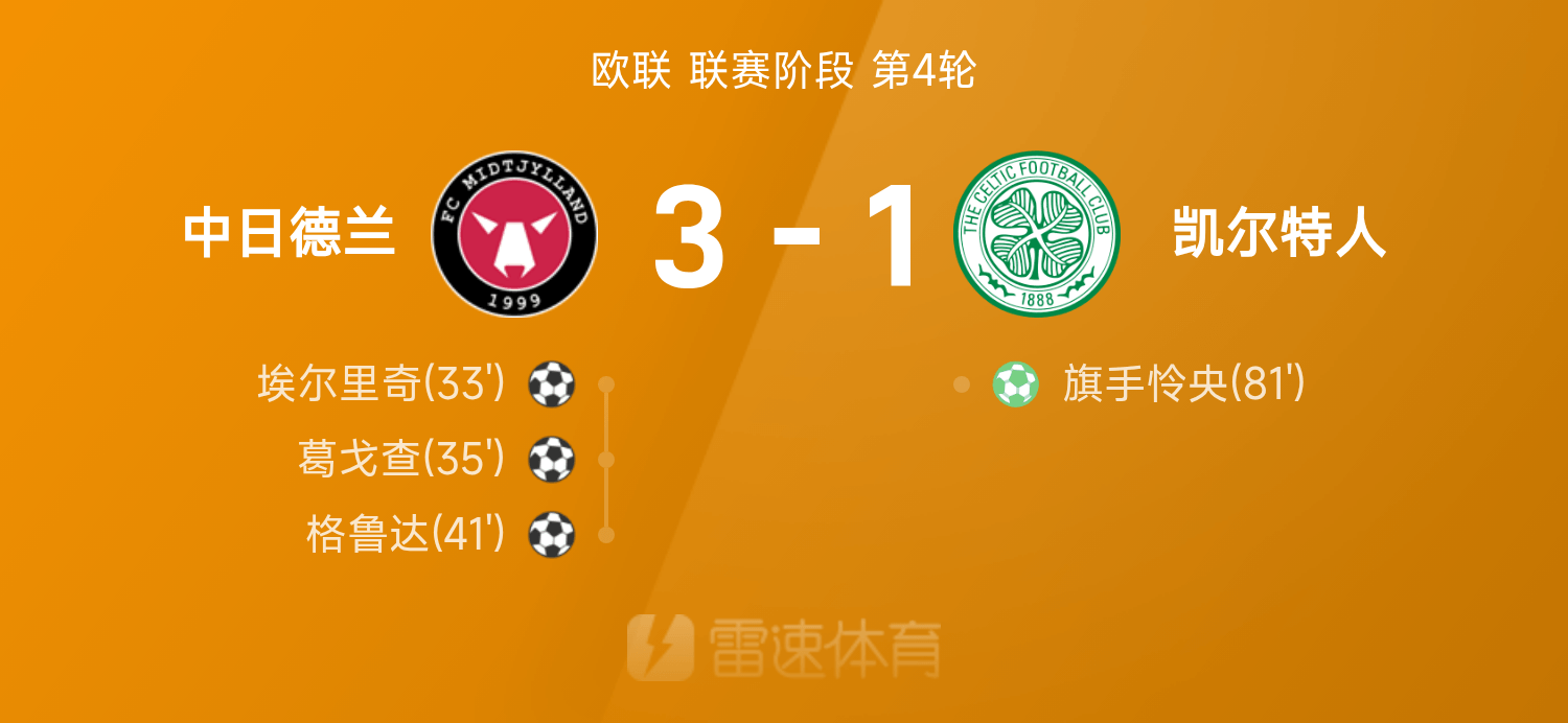 6686 Sports 7 พฤศจิกายน ในรอบที่สี่ของยูโรป้าลีก 25/26 มิดจิลแลนด์เอาชนะเซลติก 3-1 ตลอดทั้งเกม เกโกชา มีบทบาทโดดเด่น ยิงได้ 1 ครั้ง และจ่ายบอล 1 ครั้ง กรูดาและเอลริชยิงประตูได้ ส่วนผู้ถือธงเหลียนหยางทำประตูได้แต่ไม่สามารถช่วยผู้รักษาประตูได้