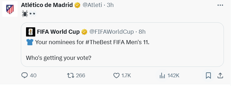 สโมสรส่งต่อรายชื่อที่ประกาศโดย FIFA บนโซเชียลมีเดียอย่างเป็นทางการ และเพิ่มอิโมจิสองตัว ได้แก่ แมงมุม (ชื่อเล่นของอัลวาเรซคือ แมงมุมตัวน้อย) และดวงตาเบิกกว้างคู่หนึ่ง โดยสื่อถึงความสงสัยโดยปริยายแต่ทรงพลัง