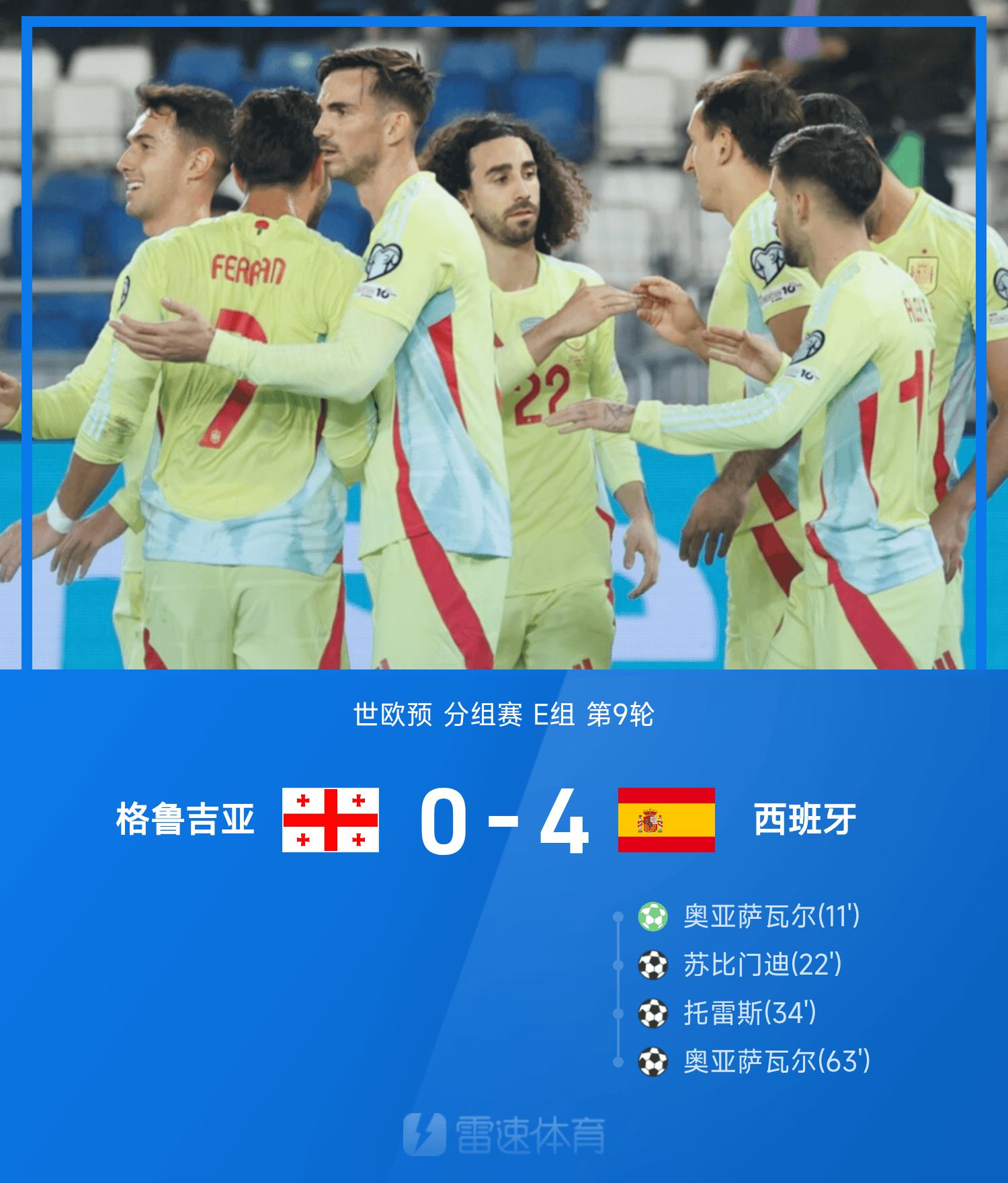 6686 Sports รายงานเมื่อวันที่ 16 พฤศจิกายนว่าในรอบที่ 9 ของกลุ่ม E ของรอบคัดเลือกยุโรปโลก จอร์เจียเล่นเป็นทีมเหย้ากับสเปน ในครึ่งแรกของฤดูกาลนี้ โอยาร์ซาบัลเปิดสกอร์ด้วยลูกโทษระยะ 12 หลา ซูบิเมนดีทำประตูด้วยการยิงนัดเดียว และตอร์เรสจ่ายบอลเข้าหน้าประตูแล้วดันเข้ามุมไกล หลังจากเปลี่ยนข้างและสู้อีกครั้ง โอยาร์ซาบัลรับบอลจากตอร์เรสและทำประตูในกรอบเขตโทษ จบเกม สเปน 4-0 จอร์เจีย หลังจากรอบนี้ สเปนรั้งอันดับหนึ่งของกลุ่มด้วย 15 แต้ม และตูร์กีเยอยู่อันดับสองของกลุ่มด้วย 12 แต้ม ทั้งสองทีมพบกันในรอบสุดท้าย