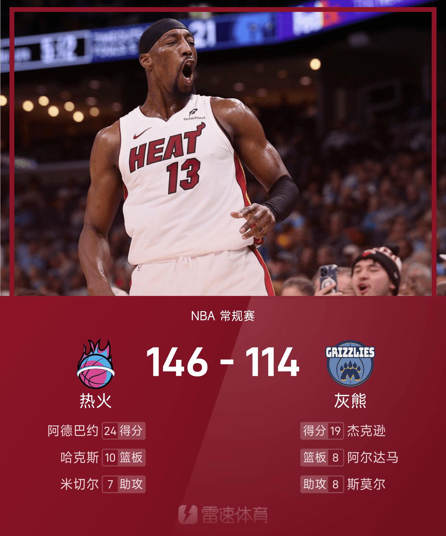 รายงาน NBA อเดบายอร์ 24 แต้ม ฮีตเอาชนะ กริซลี่ส์ 146-114