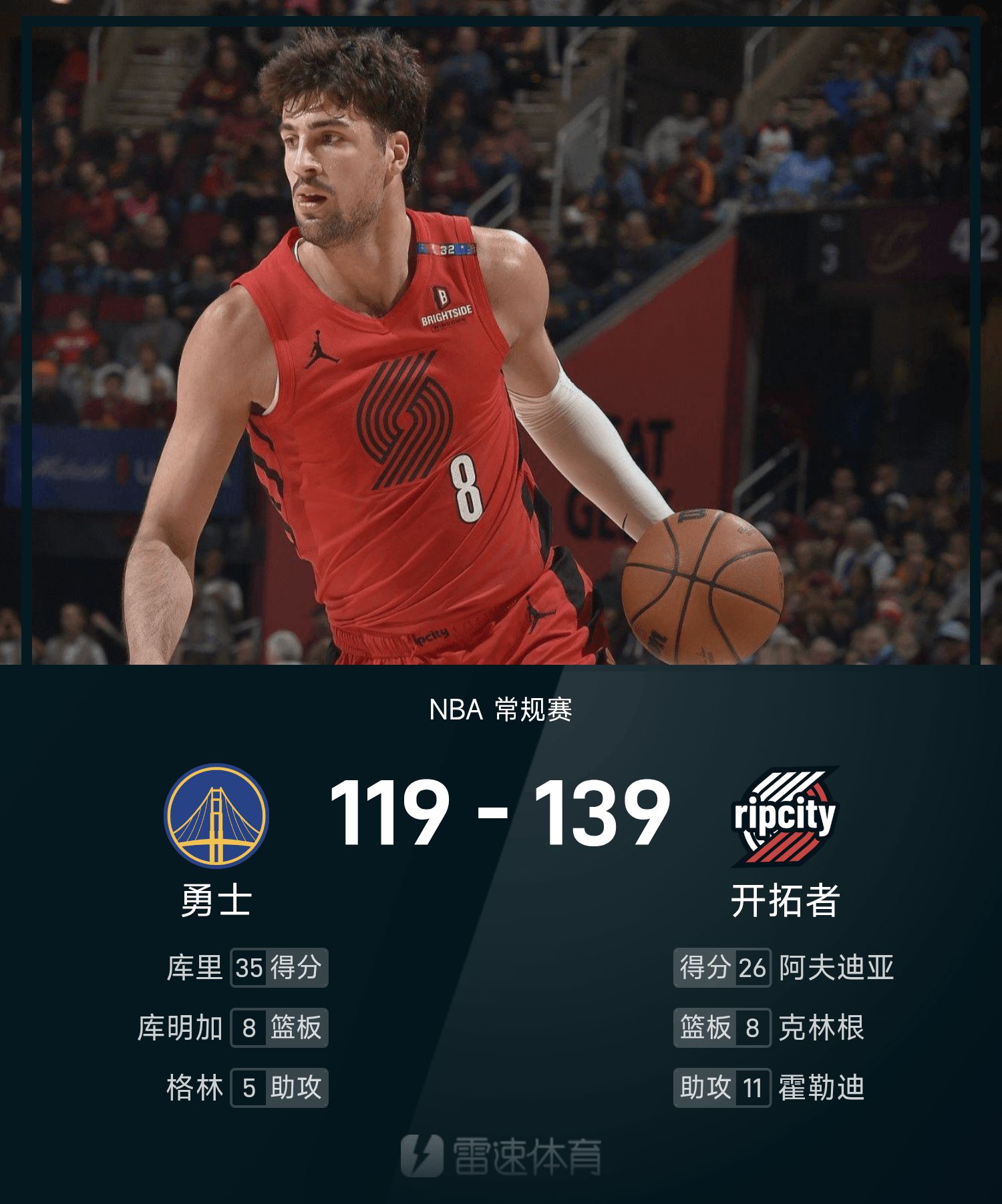 6686 กีฬา ข่าว 25 ตุลาคม ในฤดูกาลปกติของ NBA 25/26 ทีม Trail Blazers เผชิญหน้ากับ Warriors จบเกม เทรลเบลเซอร์ส เอาชนะ วอร์ริเออร์ส 139-119 อาฟดิจา 26 แต้ม 5 รีบาวด์ 6 แอสซิสต์ พาทีมคว้าชัย เคอร์รีทำคะแนนสูงสุดในเกม 35 แต้ม 6 รีบาวน์และ 3 แอสซิสต์