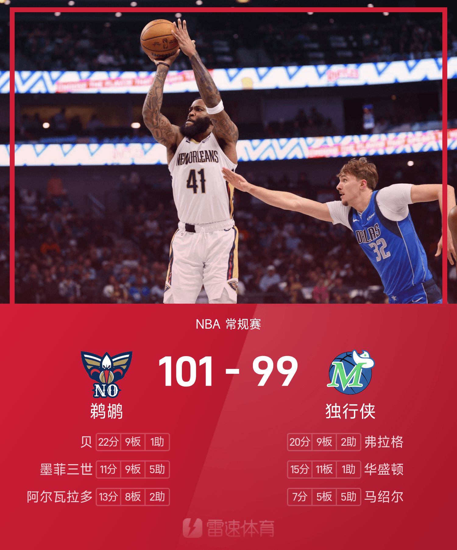 เบย์ทำคะแนนสูงสุดในเกม 22 แต้ม 9 รีบาวน์และ 1 แอสซิสต์ นำทีม Pelicans คว้าชัยชนะ แฟล็กก์ตัวเลือกอันดับต้น ๆ ของแมฟเวอริกส์พลาดเสมอกันและทำคะแนนได้ 20 แต้ม