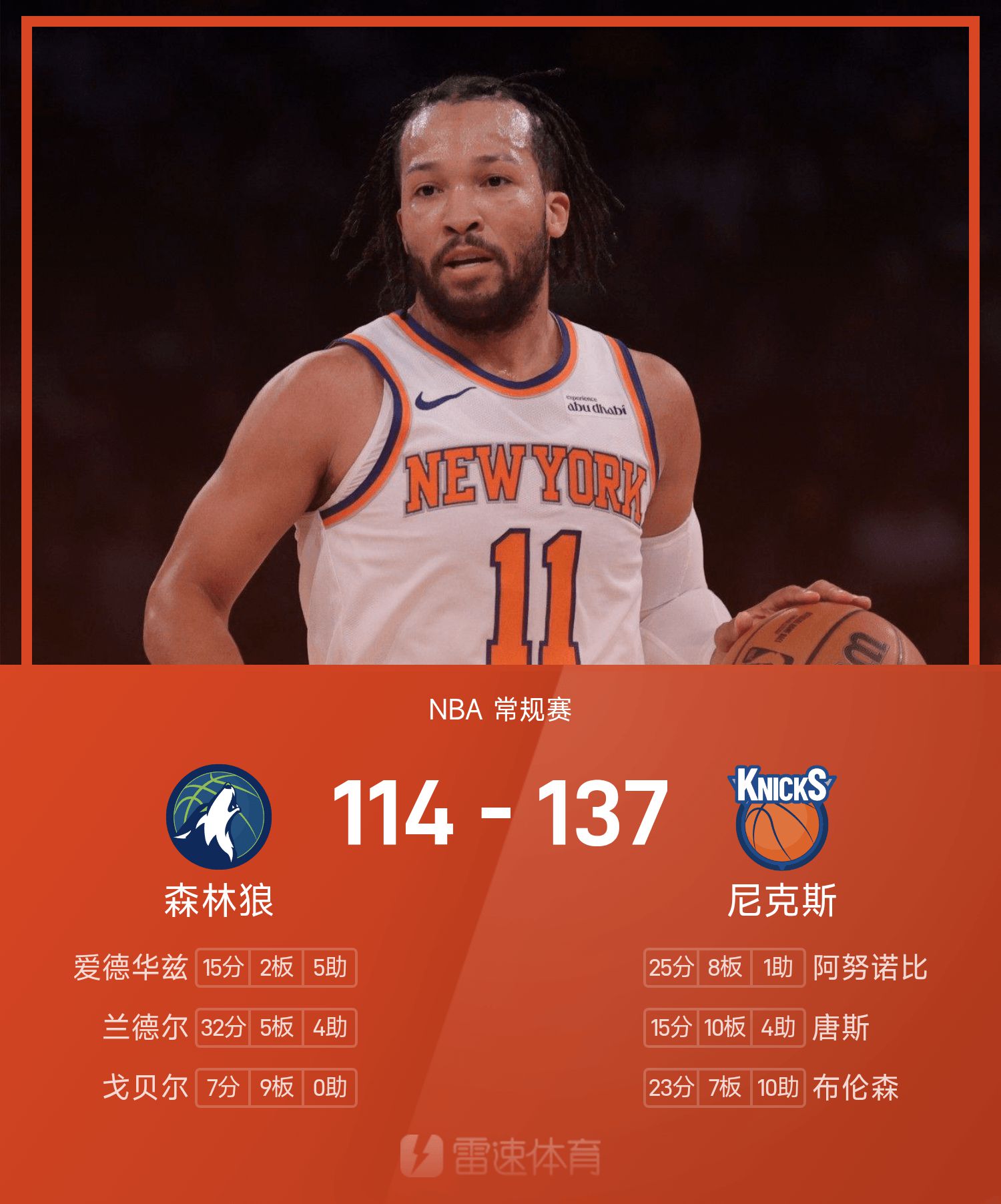 รายงานเกม NBA หัวโต 23+7+10 นิคส์ ชนะ ทิมเบอร์วูล์ฟส์ 137-114