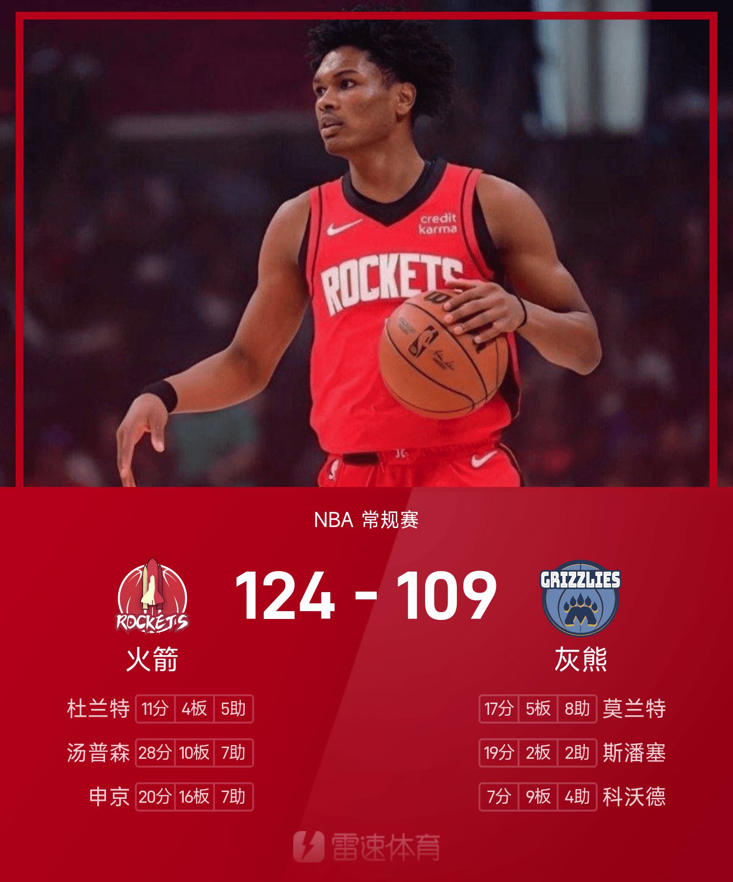 6686 กีฬา ข่าว 6 พฤศจิกายน ในฤดูกาลปกติของ NBA 25/26 ทีม Grizzlies เผชิญหน้ากับ Rockets จบเกม กริซลี่ส์ แพ้ ร็อคเก็ตส์ 109-124 อาเมน ทอมป์สันทำคะแนนสูงสุดในเกม 28 แต้ม 10 รีบาวด์ 7 แอสซิสต์ นำทีมร็อคเก็ตส์คว้าชัยชนะ