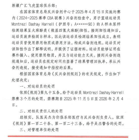 สมาคมบาสเกตบอล: Harrell ถูกพักงานเป็นเวลา 3 เดือนเนื่องจากมีการละเมิดตัวเอก และซินเจียงจะรับผิดชอบค่าธรรมเนียมการทดสอบ 36,000