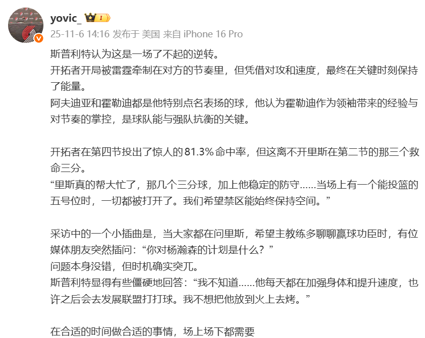 ตามรายงานของบุคคลสื่อ @yovic_ หลังจบเกม Split โค้ชชั่วคราวของ Trail Blazers Split กล่าวถึง Yang Hansen: "Yang Hansen กำลังเสริมความแข็งแกร่งให้กับร่างกายของเขาและปรับปรุงความเร็วของเขาทุกวัน เขาอาจไปที่ Development League เพื่อเล่นเกมนี้ ฉันไม่ต้องการที่จะทำให้เขาถูกไฟเผา"