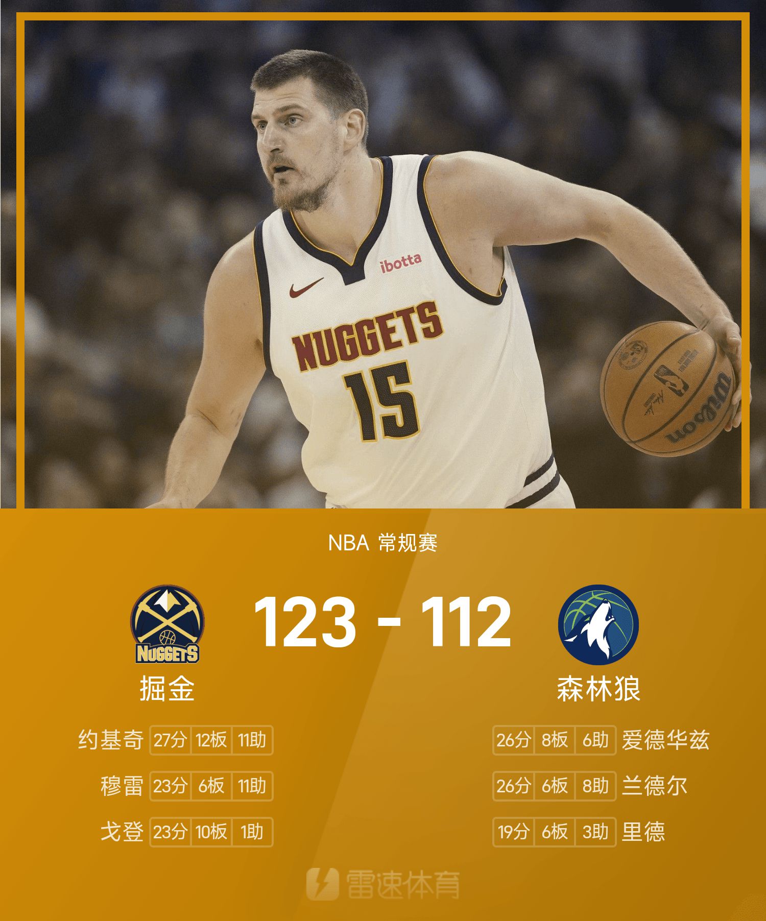 รายงานเกม NBA โยคิชมี 27 แต้ม 12 รีบาวด์ 11 แอสซิสต์ นักเก็ตเอาชนะทิมเบอร์วูล์ฟส์ 123-112