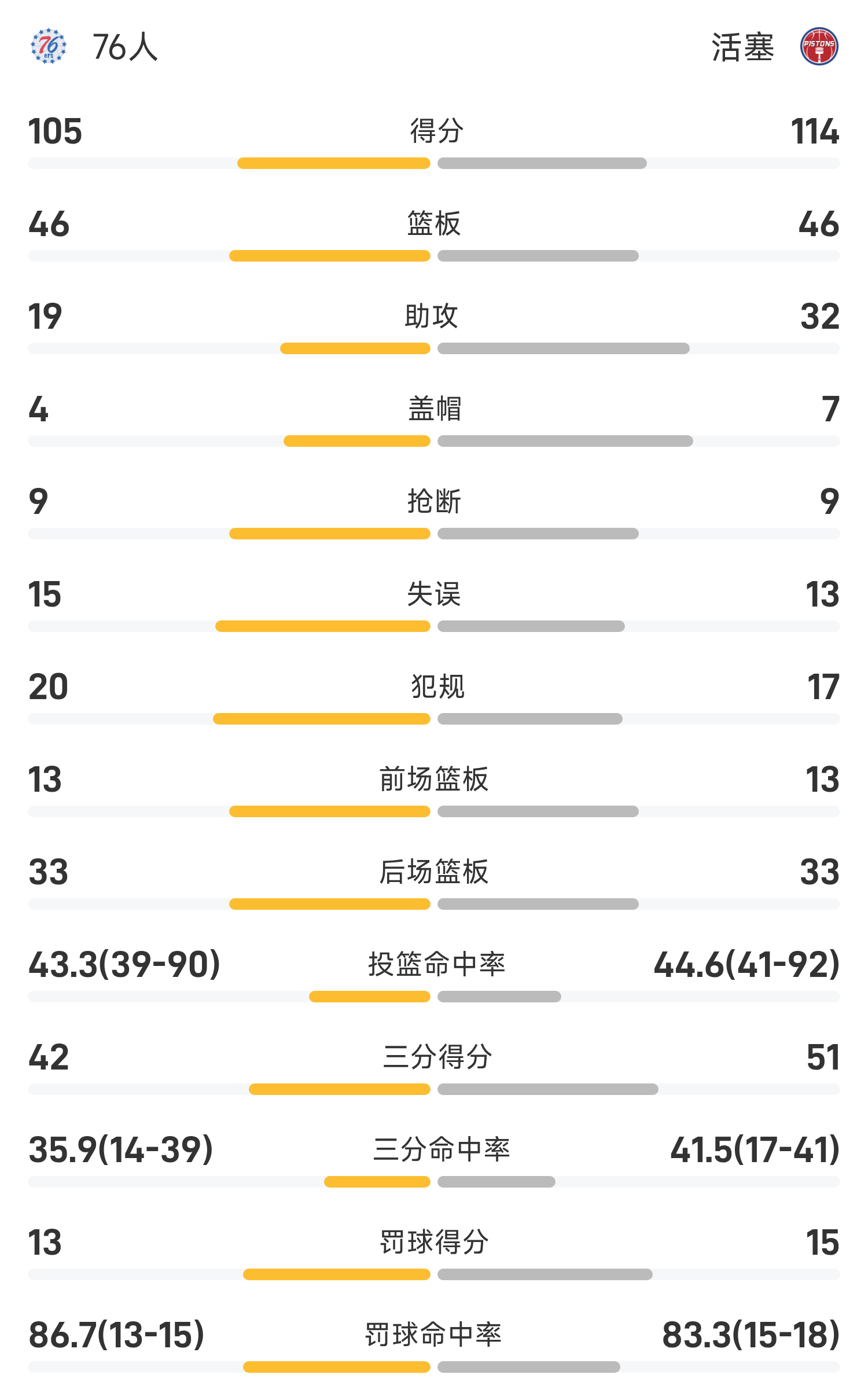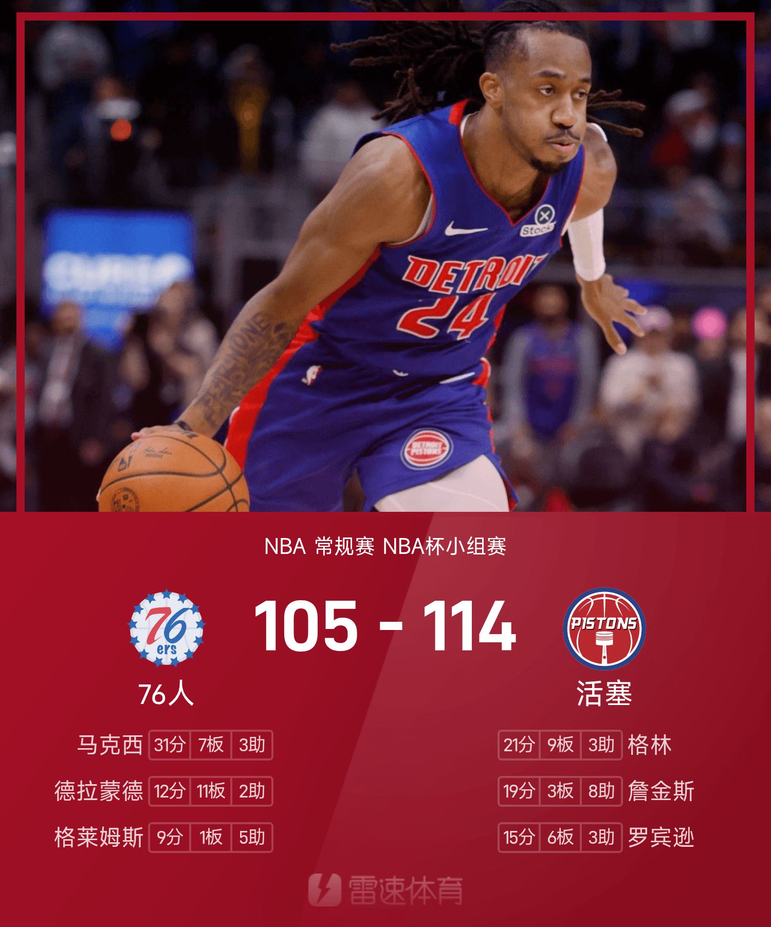 รายงาน NBA Cup: เจนกินส์มี 19 แต้ม 8 แอสซิสต์ พิสตันส์เอาชนะ 76ers 114-105